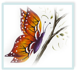 Esta mariposa pintada por el profesor Gary Rodríguez, usando las técnicas de la pintura decorativa sobre tela, la cual esta posada sobre una rama.